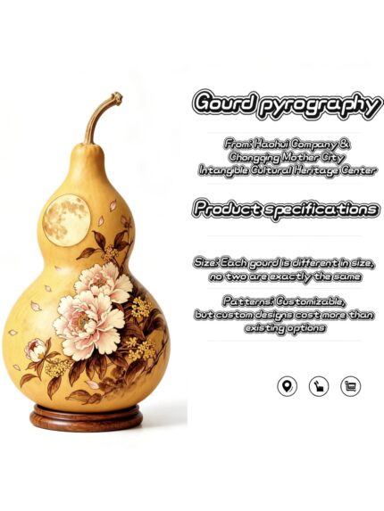 Handcrafted Gourd Pyrography Ornament | Chinese Intangible Cultural Heritage Craft Limited Unique Piece Natural Gourd Decor for Wall & Tabletop Every piece you receive is 100% handmade, never mass-produced by assembly line, and truly one-of-a-kind. It is more than just an ordinary home decoration—it is a lively Chinese folk art with thousands of years of heritage, a national-level intangible cultural heritage craft, and has long been collected by art lovers and traditional craft collectors around the world. ✨ Core Advantages of Our Gourd Pyrography 🔥 Pyrography Craft | Non-Toxic & Eco-Friendly Made from selected natural mature dried gourds, without gluing, synthetic materials, or harmful chemical pigments. Artisans of intangible cultural heritage use special high-temperature pyrography pens as brushes and heat as ink, precisely controlling temperature and strength to burn clear layered lines and natural gradient textures on the gourd surface. The entire process uses pure physical pyrography, healthy and odorless, wear-resistant and colorfast, safe for families with children and pets, ideal for long-term indoor display. 🌿 Natural Gourd Material | Unique Texture & Smooth Shape Each gourd goes through 3 strict selection processes: well-proportioned shape, solid and thick shell, fully dried and crack-resistant, with natural amber base color and unique original texture. Unlike industrially produced decorations of uniform appearance, every gourd has its own natural shape and subtle grain differences, bringing warm natural vitality to your home space, with far better texture than plastic, resin or ceramic ornaments. 🎨 Exquisite Handmade Craft | Oriental Aesthetics Each piece is meticulously handmade by senior craftsmen for more than 8 hours. It perfectly integrates traditional Chinese freehand landscapes, elegant flower-and-bird patterns, and classic auspicious motifs. Customized simple retro cultural elements are also available. With smooth and powerful lines and rich three-dimensional layers, it combines the artistic conception of Chinese ink wash painting and the texture of Western relief sculpture. Placed or hung at home, it instantly elevates the artistic taste of the space—low-key, luxurious and timeless. 🍀 Auspicious Meaning | Traditional Chinese Feng Shui Lucky Charm In traditional Chinese culture, the gourd is a classic auspicious symbol with thousands of years of history. It sounds similar to "blessing and wealth" in Chinese, symbolizing health, longevity, wealth attraction, family peace, good luck and evil ward off. Placed in the living room, entrance hall, study, office or store, it stabilizes the energy of the space and brings continuous good fortune to career, life and family health. It is a precious feng shui ornament that combines art collection and auspicious blessing, deeply loved by overseas fans of feng shui culture. 🎁 Perfect Premium Gift & Valuable Collection It is an excellent high-end choice for birthday gifts, housewarming presents, business souvenirs, art collection gifts and cross-cultural exchange gifts. Each comes with an elegant shockproof gift box, exquisite English introduction card and non-slip base, ready for direct gifting. Lightweight and compact, easy to carry and ship, not easy to damage during international delivery, making it a wonderful cultural souvenir for collecting oriental traditional crafts. 📌 Product Specifications - Material: 100% natural mature dried gourd + pure handmade high-temperature pyrography - Style: Traditional Chinese retro / Minimalist oriental art / Customizable (free lettering & picture customization available) - Craft: Pure hand pyrography, multi-temperature layered burning (The default stylish design will be shipped randomly. For custom orders, please contact us) Note: 1. This product is handmade, with each piece embodying the craftsmanship of the artisans. It's relatively expensive and may have slight unique textures, which are not considered defects. 2. For daily display, please avoid direct sunlight and damp environments. Wipe it gently to keep it clean and looking new for a long time. 3. No returns or exchanges due to non-quality issues. We'll provide each handmade item with a legitimate certificate from a recognized organization