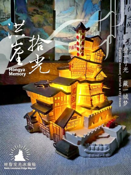 Adopting 3D modeling and fine carving technology, it completely restores the classic outlines of Hongyadong’s layered stilt houses, scattered eaves and riverside buildings. Every line is polished repeatedly, with realistic shape and coordinated proportion. It is a textured miniature architectural model in daytime, forming a unique scenery on the fridge, fully showing the beauty of Chinese architectural aesthetics and mountain city characteristics.
